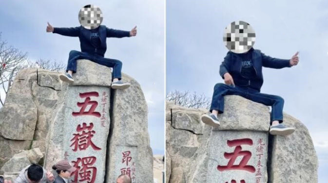 4月16日,有游客发视频说,在山东泰山景区有游客坐在石刻上拍照,该名游客坐在泰山玉皇顶著名的“五岳独尊”石刻上,石头周围聚集了大量游客正在拍照,男子张开双手、双腿让同伴拍照记录。